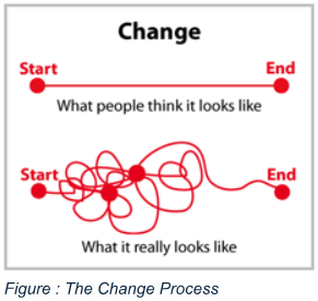These past six weeks feel like months. Although I am a seasoned change agent who understands the process, I tend to be impatient. The Bridges Transition stages overlap, so I move into the neutral zone while I continue to learn what I must release. Some days, I chide myself for not practicing old behaviors, and on others, I awake, eager to chart a new path. While we wish change were a straight line, it is not, and in the midst of it, change agents must remember and remind their clients. The bottom line in Figure 1 accurately depicts change activities and how people experience change events. Even though we know what change looks like, we plan as though it is a straight line from start to end. Bridges’ transition model helps leaders plan for what change “really looks like.”